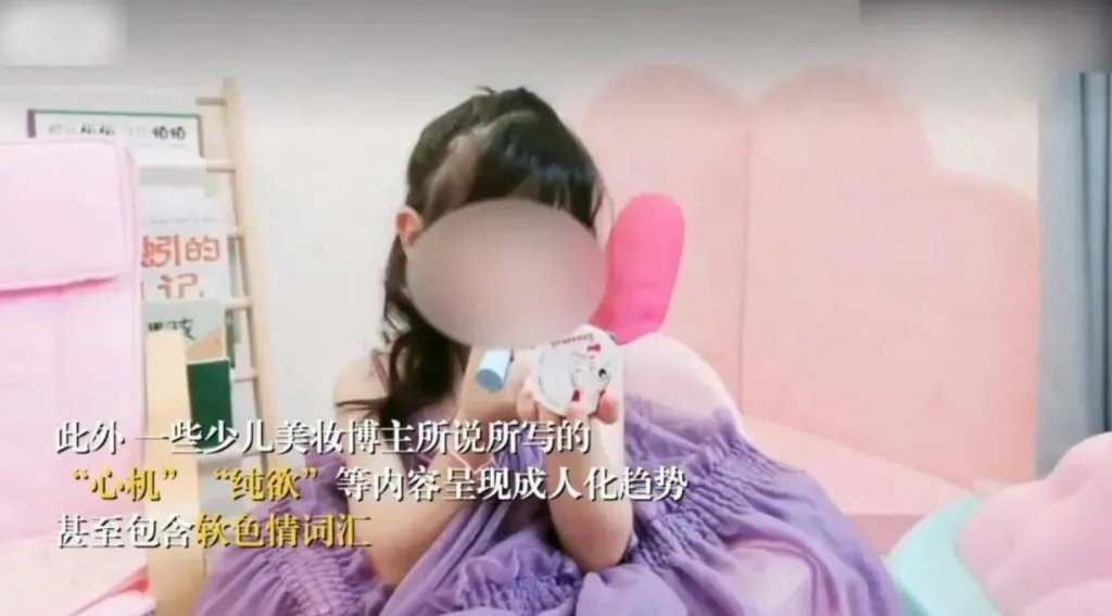 5岁小女孩拿着粉底、眼影,奶声奶气地教成人化妆 图源:“人民日报”微信公众号